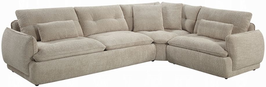 The Jonina sectional features soft beige chenille fabric, plush full-foam and down-feather blend cushions, and a sturdy solid-wood frame. It includes four matching pillows for added comfort and effortless style. A modern, inviting setup with a luxurious texture that complements any living space.Read More