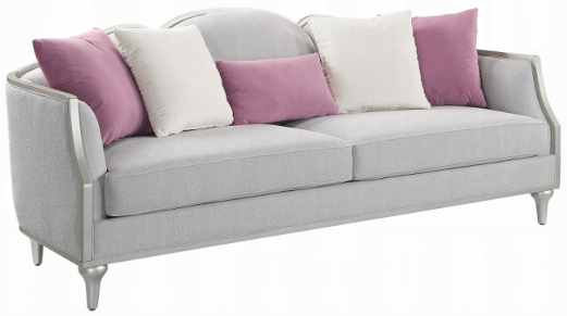 This sofa is a modern take on the French-traditional style. Five throw pillows in varying colors and sizes are included.