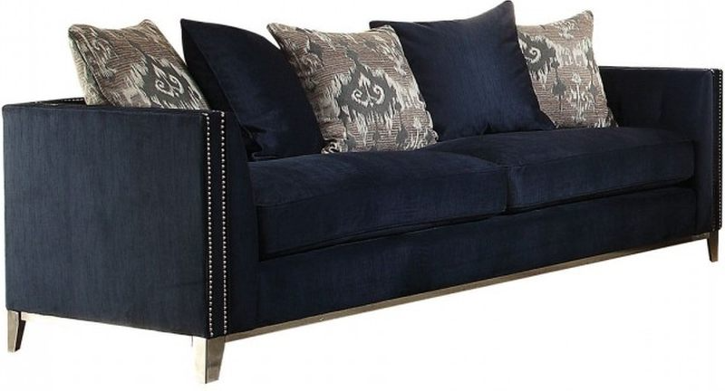 The Phaedra sofa is an ideal choice for any living room. This blue upholstered sofa features decorative nailhead trim, pocket coil seating, tight back and loose seat cushions. Five duck feather filled pillows are included for better and comfortable back support.Read More