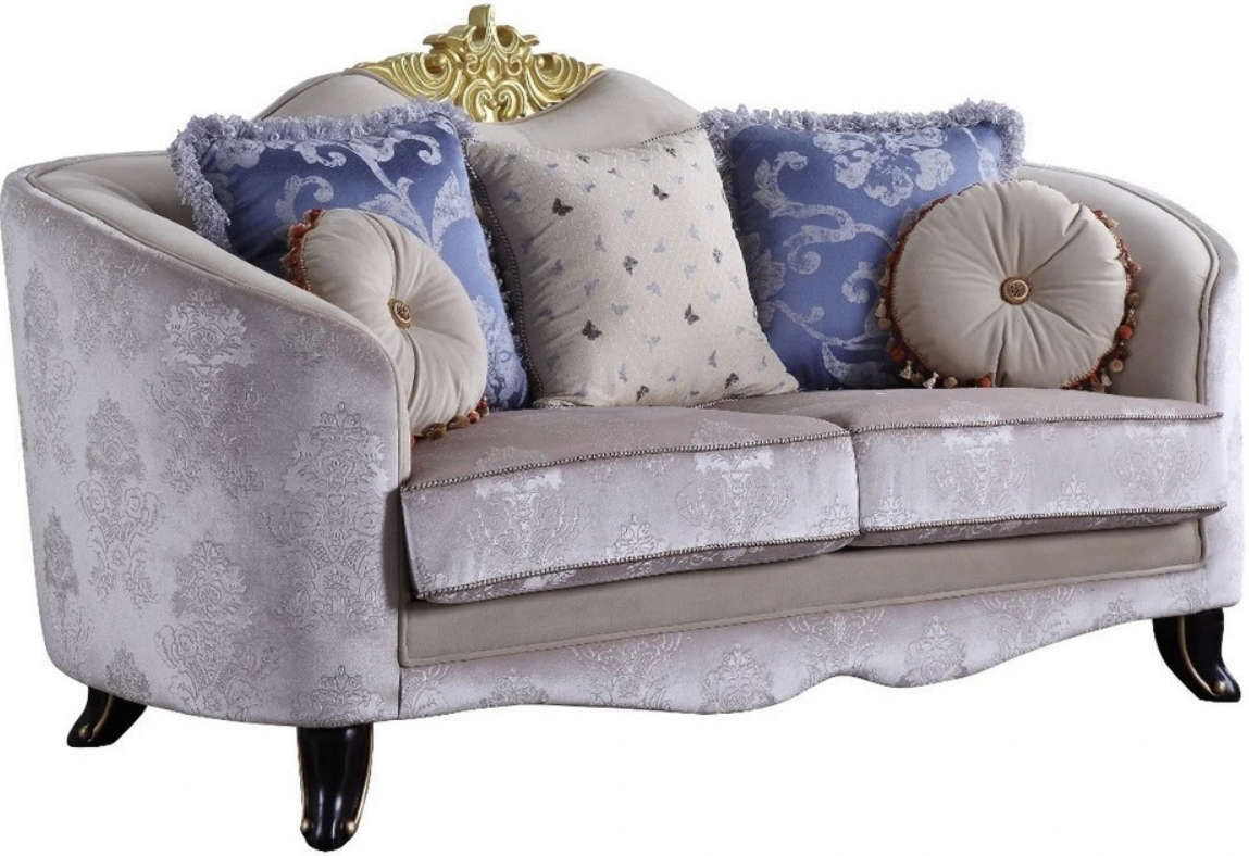 The Sheridan loveseat is defined by comfort and style. This beautiful loveseat features a solid wood molding crown with a tight back and loose seat cushions in classic cream fabric upholstery. This piece of this sophisticated living room set boasts of elegantly arched backrests and curved arms.Read More