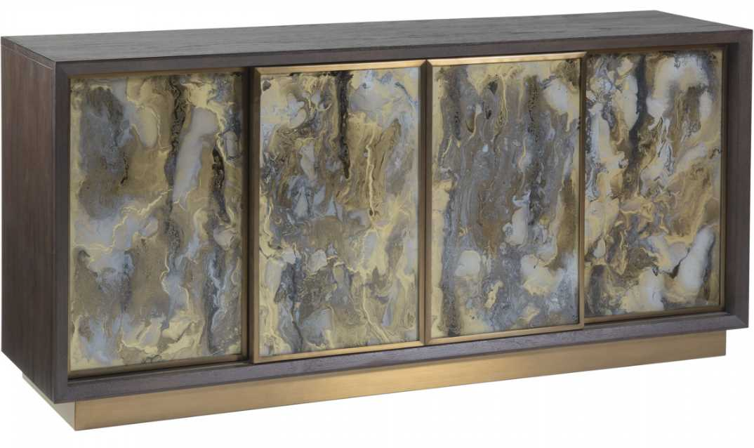 Vintage Modern inspired design in white oak veneers and select hardwood. This contemporary console features four sliding doors with original artist Eglomise panels, with vintage brass door frames and plinth base. The four adjustable shelves and ventilated removable back panel complements media storage.Read More