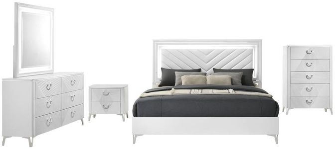Crisp white high gloss and sculptural textures define this modern bedroom set, blending sleek surfaces with dimensional details. Geometric drawer fronts feature ribbed V-patterns and polished chrome pulls, while all drawers glide smoothly on 45mm metal extension hardware.Read More