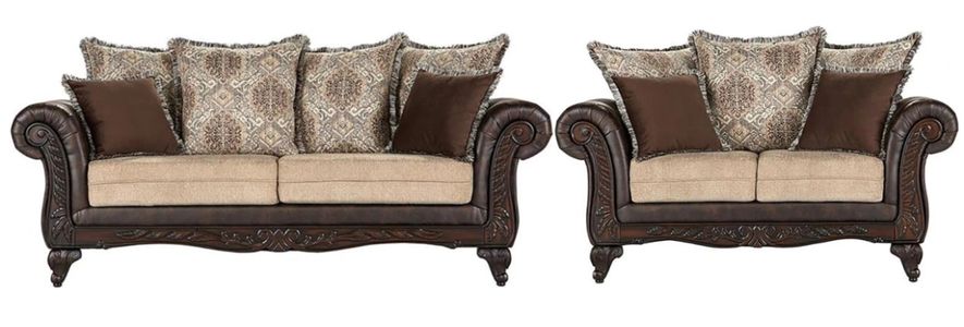 Embrace the allure of old-world charm with this lavish two-piece sofa and loveseat set, a testament to American craftsmanship. The sofa's grandeur and the loveseat's comfort blend seamlessly, featuring dark brown faux leather that contrasts magnificently with the light brown and patterned fabrics.Read More