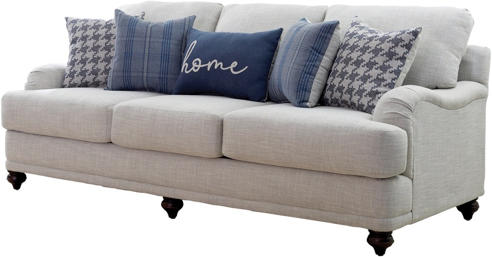 Farmhouse inspiration delivers a fresh, stylish look to a transitional space with this exceptional sofa. With tailored English arms and turned legs offering a contrasting espresso finish, this sofa shines with a pale grey linen-like upholstered cover.Read More