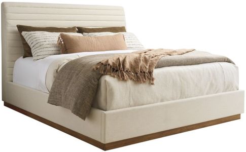 The Coronado upholstered platform bed features horizontal channeling in the headboard, upholstered side rails and footboard, and a recessed wooden plinth base. The bed is standard in 2343-11 Sailview, an indoor performance fabric with a linen weave and soft hand.Read More