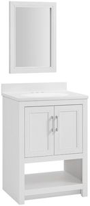 Complete Vanity Set with Mirror & Top: This elegant vanity combo includes a matching 18" wide framed mirror and a durable, white composite one-piece countertop & sink, pre-drilled for 4" centerset faucet kits (sold separately)