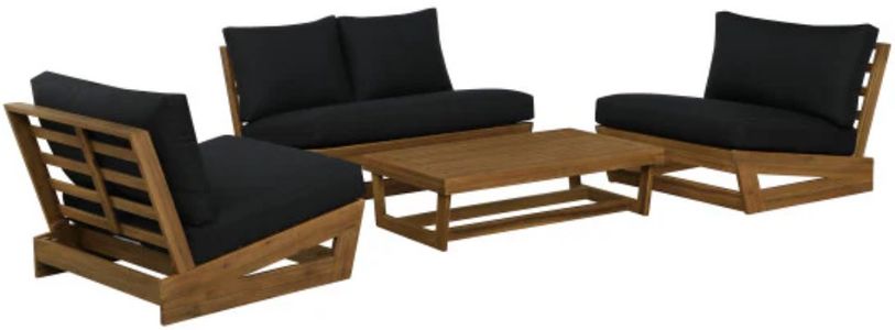 Clean, angular frames give the set a tailored presence, while the low-profile silhouettes keep things open and airy. The plush cushions are wrapped in 100% black polyester for year-round resistance to fading and stains, delivering comfort that holds up beautifully through sun, spills, and seasons. Whether arranged around a fire pit or styled on a modern patio, this set invites relaxed conversation with a sleek, modern look that adapts to your space.
