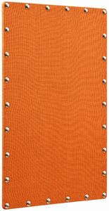 Fun orange burlap over fiberboard accented with shiny silver nail heads