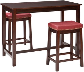 Make a bold statement with this elegant 3-piece counter set, both timeless and practical in tight quarters. The streamlined pub table in a rich brown stain provides a sleek and sturdy foundation, while the two matching counter stools add a pop of color with their mottled red faux leather upholstery.Read More