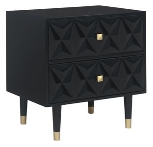 With its geometric patterned front, this geometric black nightstand will add texture and depth to your space. The nightstand has a full textured geometric front accented with square gold hardware and round, gold dipped legs. It is truly dressed to impress!Read More