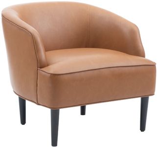 This midcentury-inspired accent chair checks all the boxes for an inviting and stylish seating solution in your living room, reading nook, or entryway. Faux leather is stretched over the low back, roll arms, and plush seat cushion for the look and feel of genuine animal hide without the drawbacks.Read More