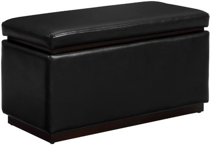 Out of sight storage, style, and comfort come together as one to form this versatile ottoman. The padded exterior is upholstered in black faux leather, offering a welcoming seat or footstool for two to kick up their feet without overcrowding.Read More