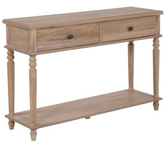 Turned legs and antiqued drawer pulls nod to traditional design, adding timeless elegance. Two roomy drawers offer discreet storage, while the open lower shelf is perfect for baskets, books, or seasonal décor. Measuring 48" wide, 14" deep, and 32" high, it’s ideally scaled for entryways, behind sofas, or narrow living room walls.