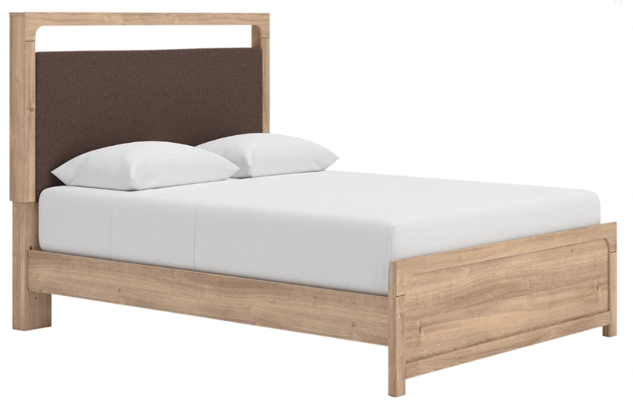 The natural wood tones and clean lines of this queen upholstered platform bed echo your easygoing style sensibilities. With a warm finish and replicated oak grain, its carefree character lightens up your bedroom. Curved inner corner details soften the look, while contrasting brown fabric modernizes the feel.Read More