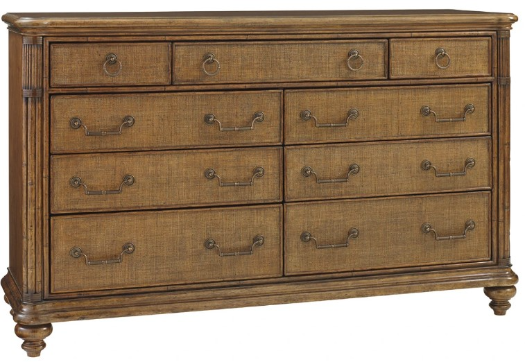 Functional as it is stylish, this dresser features nine drawers with woven raffia fronts. These are complemented by bamboo carved posts with leather wrapped pencil rattan accents and bun feet.Read More