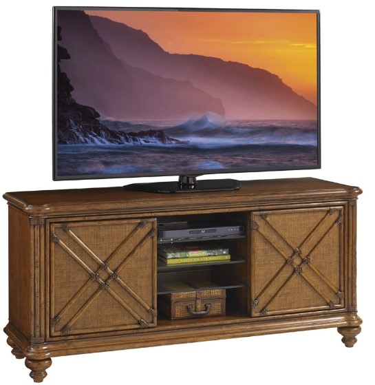 The 65-inch console offers remarkable functionality. The center compartment has three adjustable glass shelves. The left and right compartments feature two adjustable wooden shelves. The dual sliding doors, which showcase rattan fretwork over woven raffia, can be positioned to conceal any two compartments. The piece also has built-in ventilation and grommet for electrical cordsRead More
