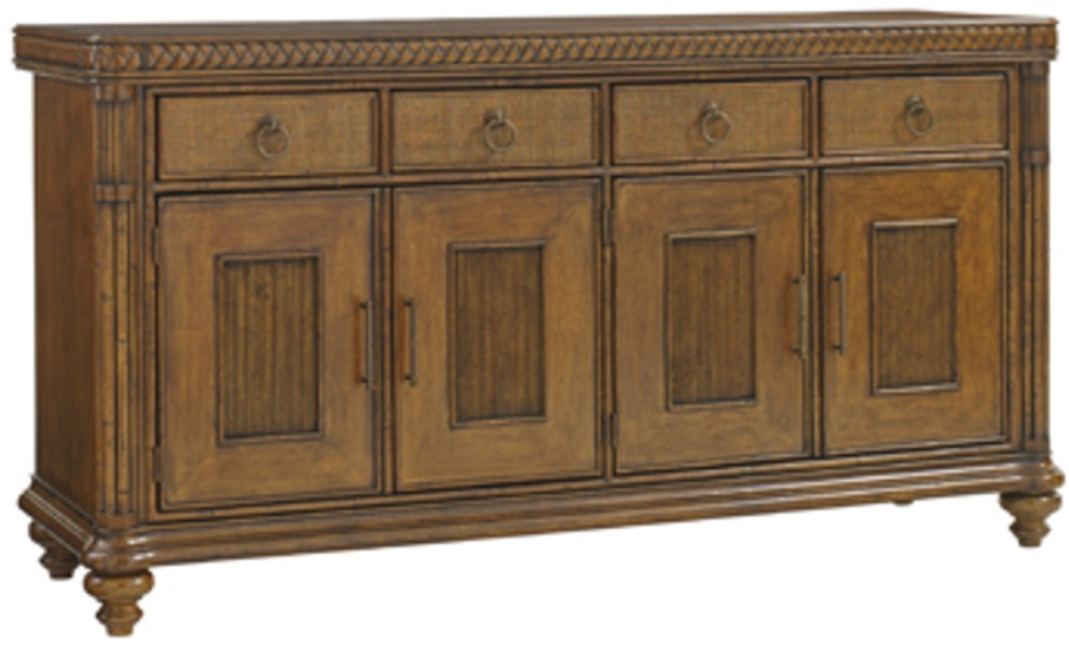 As functional as it is stylish, this buffet features four wood framed doors with pencil rattan panels, four adjustable shelves behind the doors and four drawers with woven raffia fronts. The left and right side facing drawers are felt lined, while the center drawers are felt lined and divided for silver.Read More