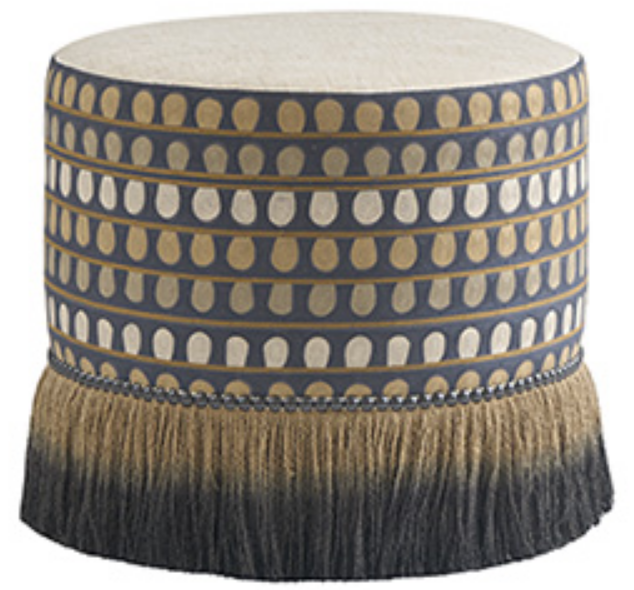 The 22-inch Lamar swivel ottoman is a signature item in the collection. The custom bullion fringe on the skirt and one-half inch smoke nailhead trim are both standard on the piece. The seat and perimeter fabrics can be customized.Read More