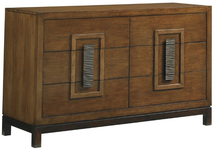 Featuring six drawers, the double dresser showcases the collection's signature custom hardware. The artisan pulls look like a single piece from a distance, but are actually separate sections on each drawer front. The contemporary molding surrounding the hardware draws attention to the design by framing it on the piece.Read More