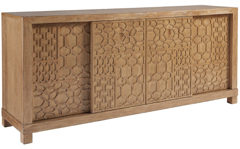 The 79-inch media console features an intriguing tribal design in the fretwork of the four sliding bypass doors. The functionality allows for the interior or exterior compartments to be open, or for all compartments to be concealed. The interior has 8 adjustable shelves and one large storage drawer.Read More