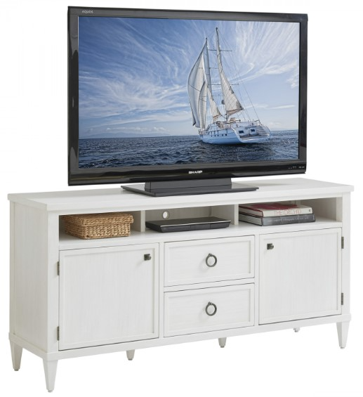 The Dockside media console features an open compartment with partitions at the top to accommodate a sound bar. Behind each door is an adjustable wooden shelf. Two drawers in the middle offer ample storage for media accessories.Read More