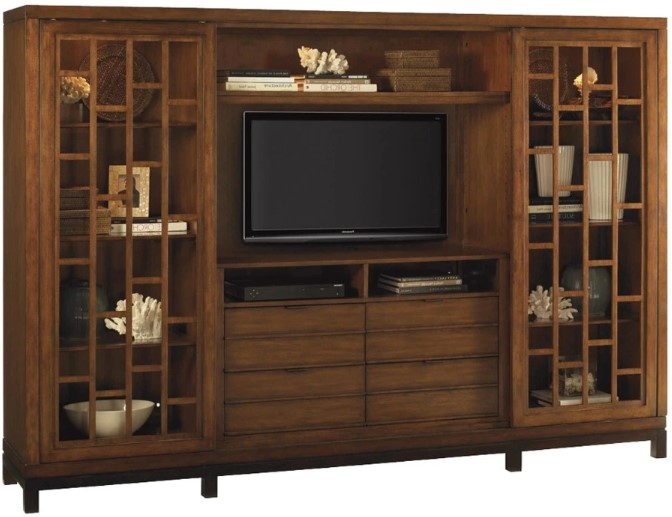 Form and function are equal partners in the media room, with the open fretwork sliding doors showcasing decorative accessories on bookcase ends, or featuring the television and storage options including four drawers and seven adjustable shelves.Read More