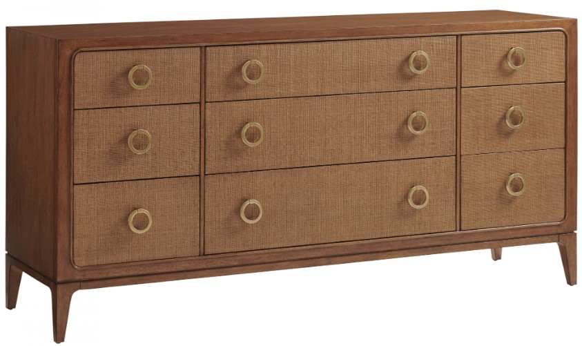 The 74-inch dresser features nine soft-close drawers with woven raffia drawer fronts. Note the touch of Mid-Century styling in the soft radius corners of the drawers. Transform the look of your home, and convey the effortless style of destination living.Read More