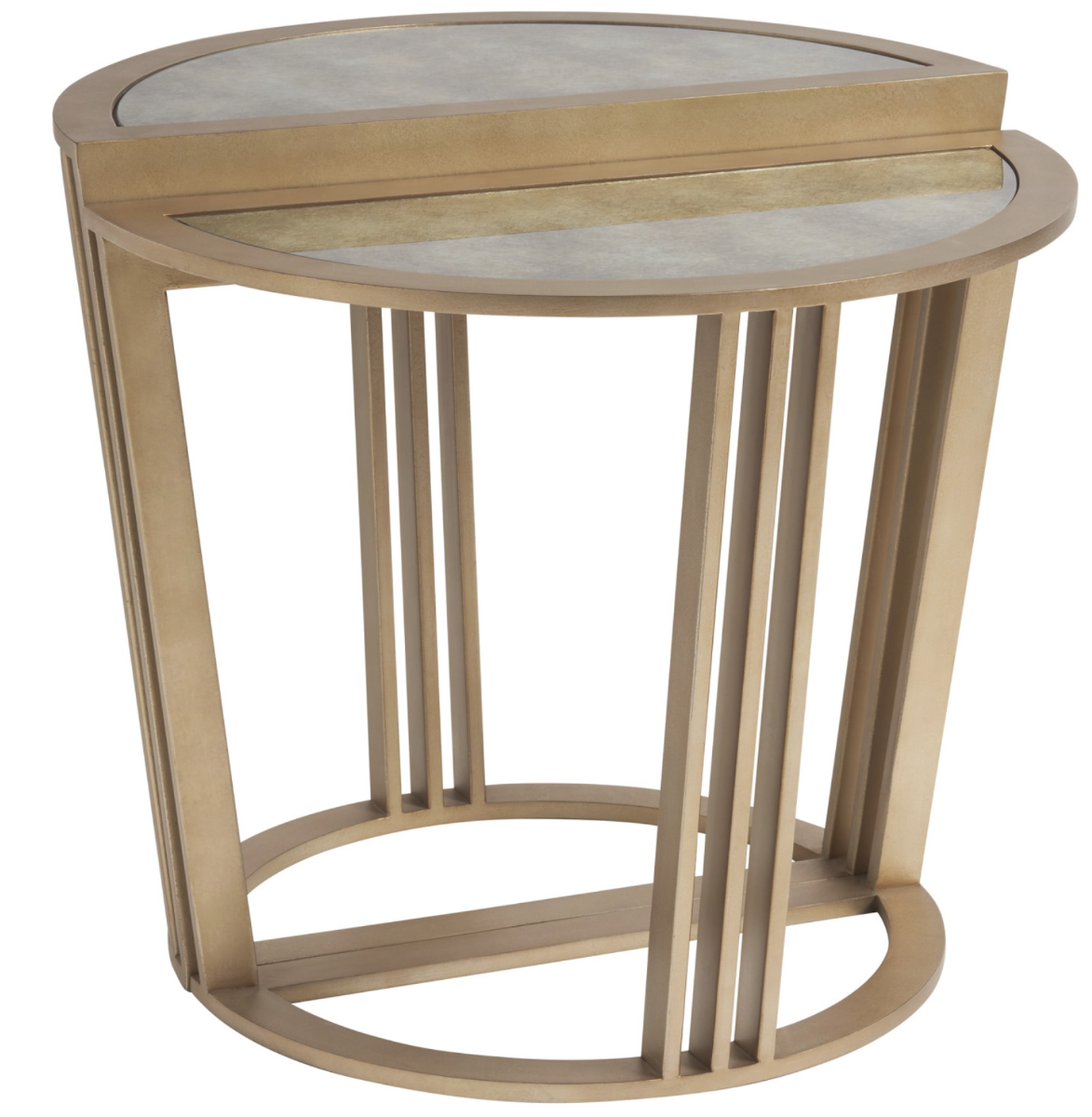 The Brook bunching accent table is comprised of two semi-circular tapered architectural metal bases in the champagne finish. The heights vary by 1.5-inches offering a unique tiered look. Inset glass tops feature a custom emerald and burnished silver leaf finish.Read More