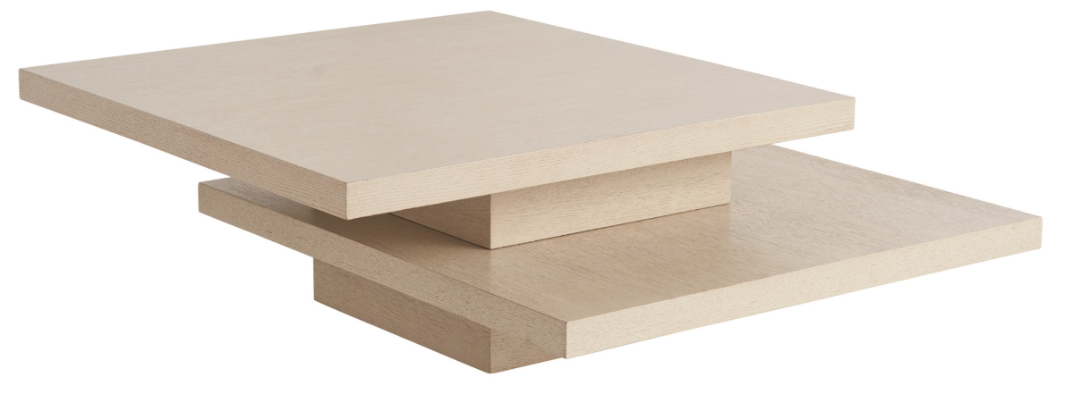 The Prescott tiered cocktail table features two asymmetrical 36-inch square tops offset around a pedestal base giving the table an overall dimension of 44 x 44-inches. The straight grain pattern on the top surface is perpendicular to the surface below it, offering a unique visual perspective.Read More