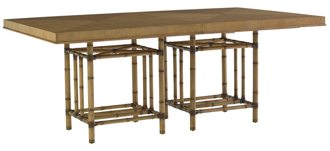 Proving that a casual lifestyle and a sophisticated designer look are not mutually exclusive, the rectangular dining table features leather-wrapped bamboo carved moldings, a four-way book matched veneer top and antique brass finished metal ferrules. The table can comfortably seat ten when utilizing both 22-inch leaves.Read More