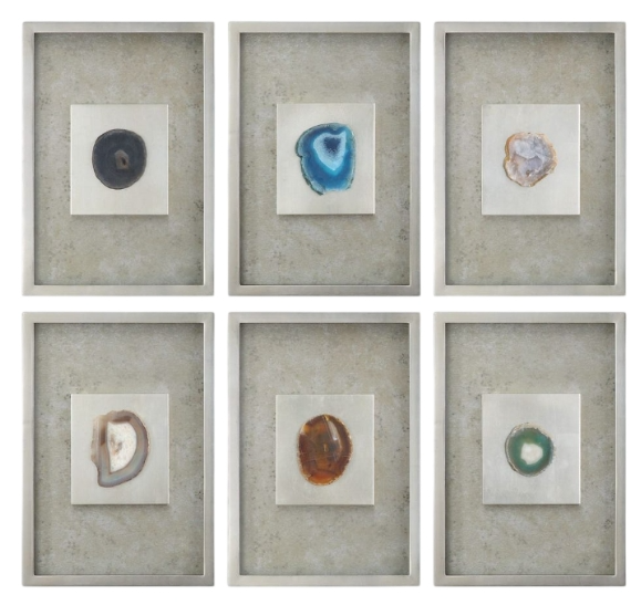 Mottled silver champagne background encasing slabs of colorful agate stone under glass