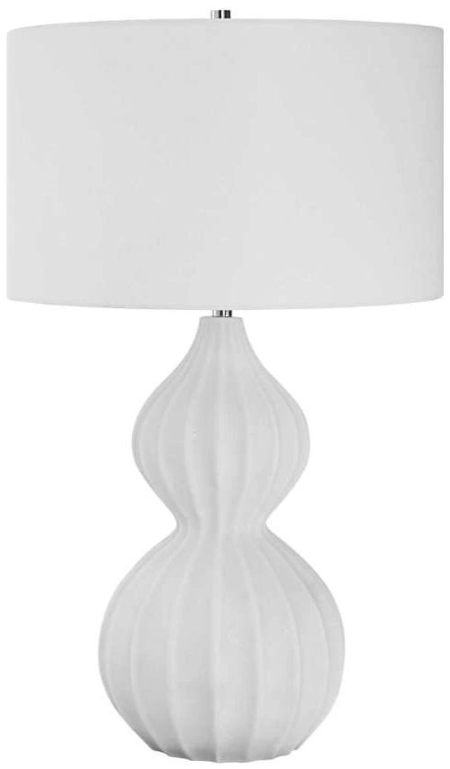 This table lamp is executed in a rich ivory man-made stone that accurately replicates the look of Thassos marble featuring scalloped ridges and polished nickel accents. The round hardback shade is covered in a white linen fabric.Read More