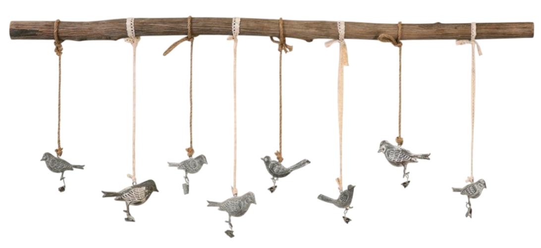 Light ivory glaze suspended from a natural elm branch with ivory ribbon and natural rope