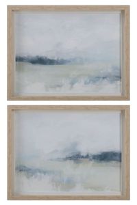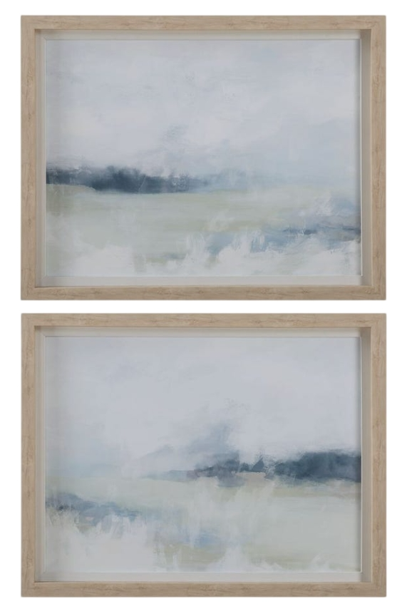 These tranquil landscape prints are shown under glass featuring watercolor shades of navy blue and sage. Each print is accented by a white linen liner and a natural wood tone frame. Artwork by June Vess.Read More