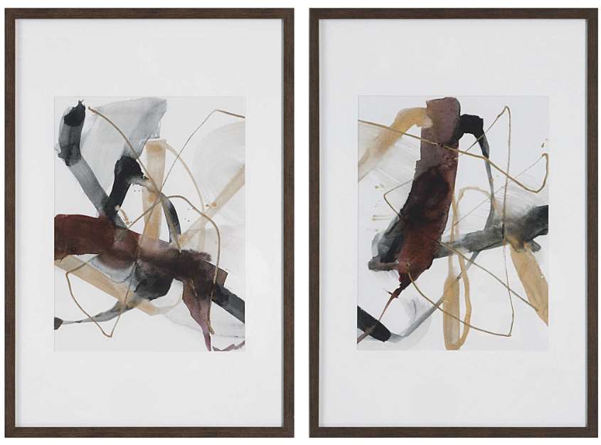 This abstract artwork displays a harmonious blend of neutral brushstrokes in gray, black, and warm chestnut tones. Each print is accented by a white mat under glass with a dark walnut-finished frame. Artwork by Jennifer Goldberger.Read More