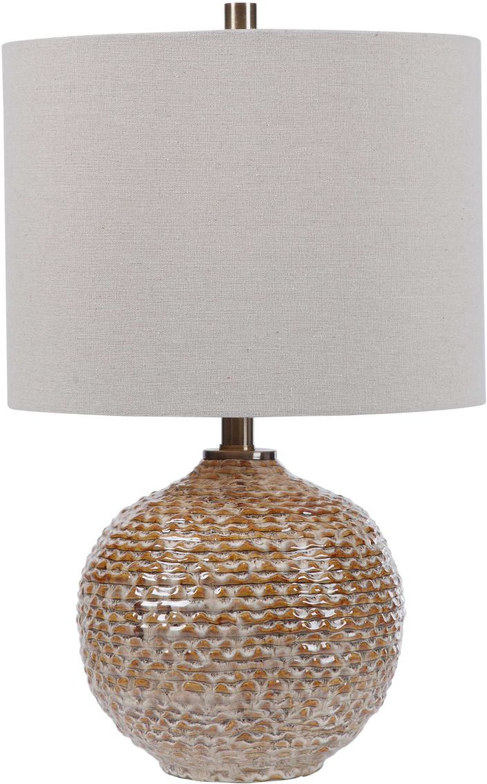 This unique ceramic table lamp displays a rustic, wavy ribbed texture in rust brown glaze covered in aged taupe tones, accented with light brushed brass details.Read More
