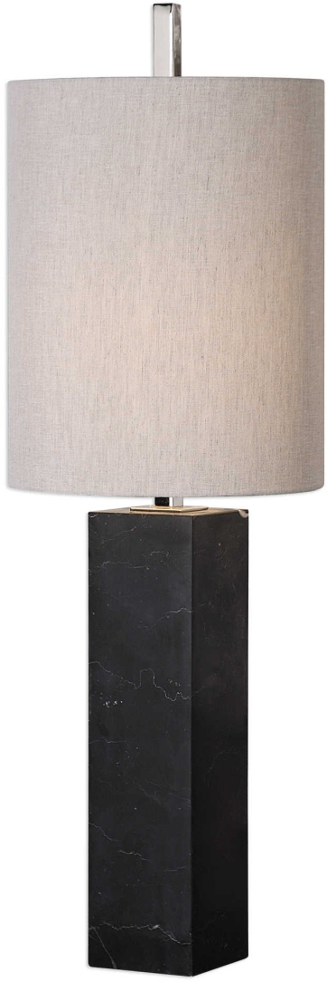 Chunky, black marble column, with subtle white veining, accented with polished nickel plated details. The tall, round hardback shade is a light beige linen fabric.Read More
