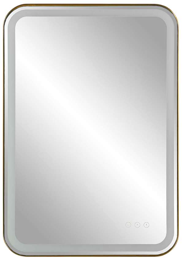 Versatile in design, this vanity mirror has integrated LED lighting that illuminates through the frosted strip in the polished-edged mirror. The brushed brass-plated stainless steel frame is offset from the wall to allow ambient lighting from the back.Read More