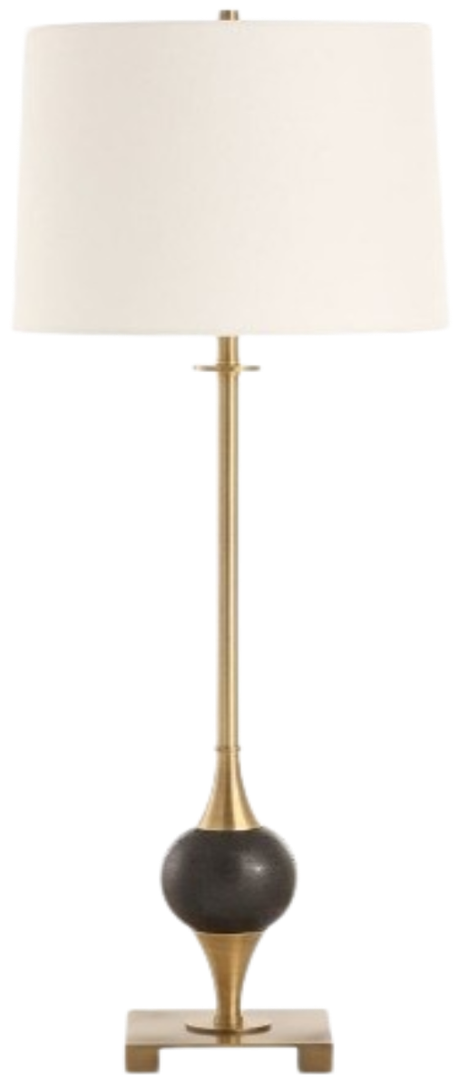 The Dempsey Buffet Lamp features a sleek, sophisticated plated brass base with a complementary foot, elevated by the addition of a striking black dolomite marble orb. The slightly tapered round hardback shade is covered in a casual white linen fabric.Read More