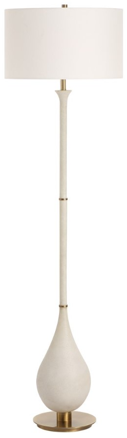 Featuring a teardrop-shaped base made of ivory man-made stone that accurately replicates the look of Thassos marble, accented with plated brushed antique brass details, the Dewdrop floor lamp is a refined addition to any space. The round hardback shade is a crisp white linen fabric.Read More