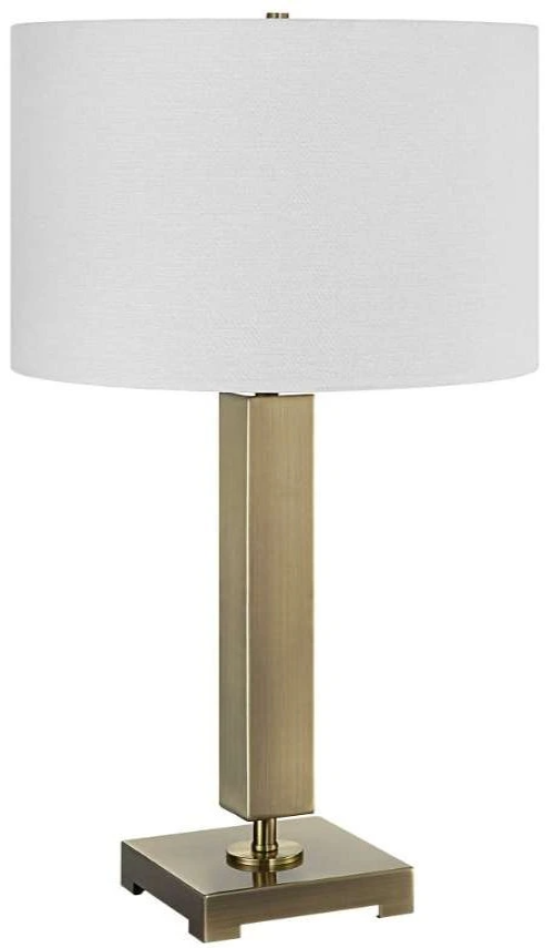 This sophisticated table lamp showcases a streamlined metal column base finished in antique brass. The round hardback shade is covered in white linen fabric. Make a bold statement by incorporating this stunning lighting into your home.Read More