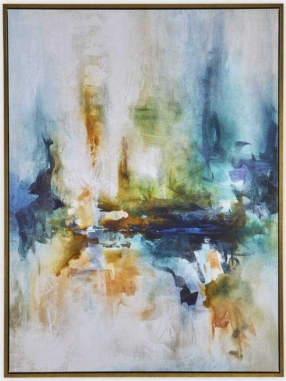 Giclee on canvas, this abstract piece features blue, teal, yellow and orange colors highlighted by off white accents. A solid wood gallery frame with gold finish completes the artwork. May be hung horizontal or vertical. Each canvas is proudly handcrafted and printed in the USA. Artwork by Leah Rei.Read More