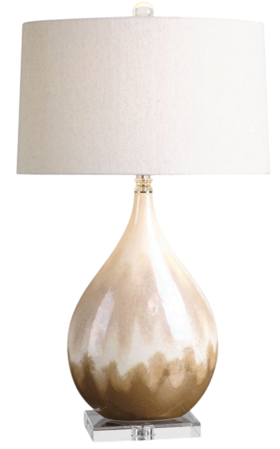 Ceramic base finished in a metallic rust beige glaze with ivory undertones and crystal accents. The slightly tapered oval hardback shade is a light beige linen fabric with natural slubbing.Read More