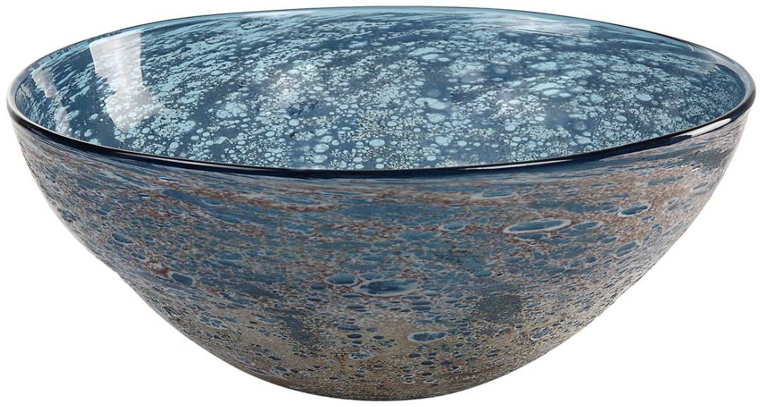Organic, blown glass bowl resembles a planet's atmosphere illuminated by stars floating in the galaxy. The aqua glass has a textured, volcanic white and gold matte finish. The Genovesa bowl is not merely a decor piece; it's a statement of refined taste, testament to the artistry that defines your space.Read More