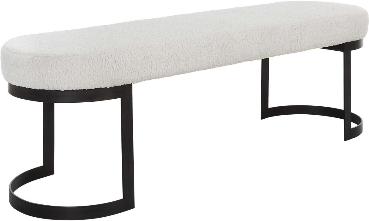 Merging simplicity with style, this bench features a thick hand forged iron base finished in matte black. The plush seat is upholstered in natural faux shearling fabric.Read More