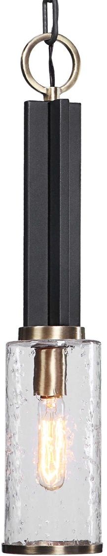 Refined industrial with clean lines on our 1 Lt. mini pendant features a sanded black finish on the I-beam style frame with refined antique brass accents and clear meteor shower glass shade. With 1-60 watt max, Edison socket and includes 1-40 watt clear T10 bulb. Supplied with 12' wire and 5' chain for adjustable installation.Read More