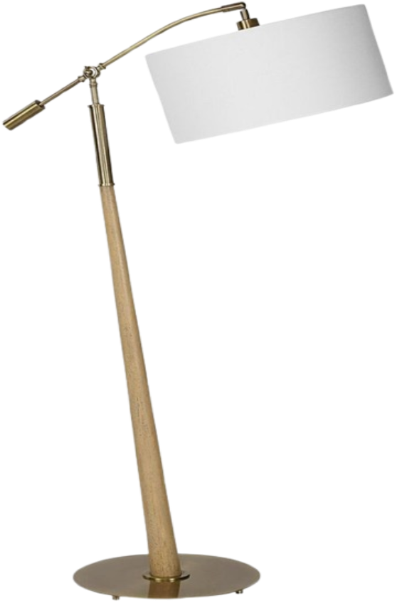 The Kennett Floor Lamp's blend of modern and classic materials makes it a versatile choice for any space. It features a tapered wooden base balanced on a plated antique brass foot, complemented by a matching adjustable shade arm. The round hardback drum shade is a casual white linen fabric.Read More