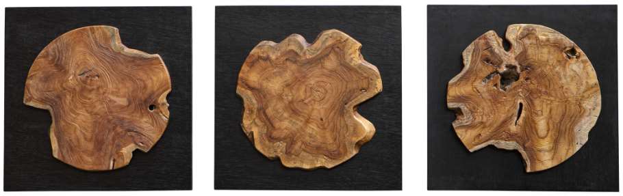 This striking set includes three satin black wood panels featuring deeply grained cross sections of natural teak wood. Sizes and grain patterns may vary due to their authentic nature. Make a bold statement by incorporating this stunning home decor into your home.Read More