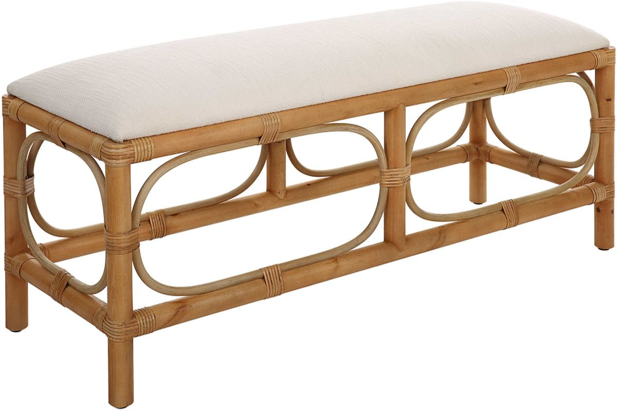 A refreshing coastal accent featuring a crisp white textured fabric, over a naturally finished solid wood base with rattan wrapped accents. Perfect at the foot of a bed or as additional family room seating.Read More