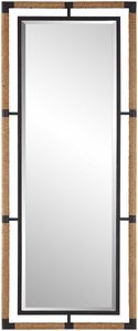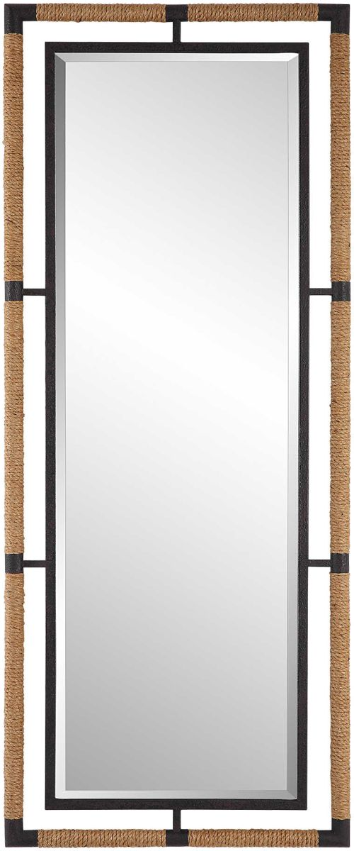 This forged iron mirror frame is finished in a textured rust black that is wrapped in natural rope bringing a coastal feel to any room. The mirror is surrounded by a generous 1 1/4" bevel. May be hung horizontal or vertical.Read More